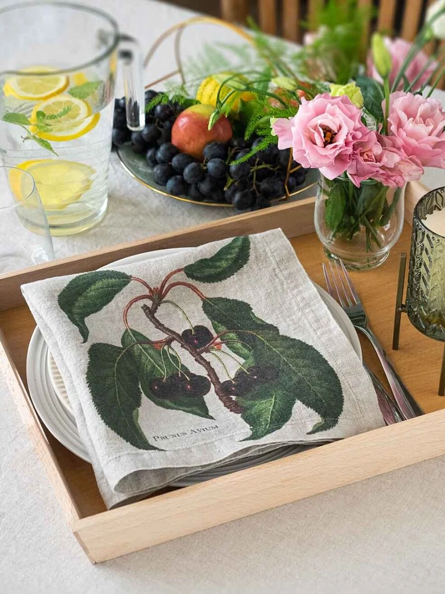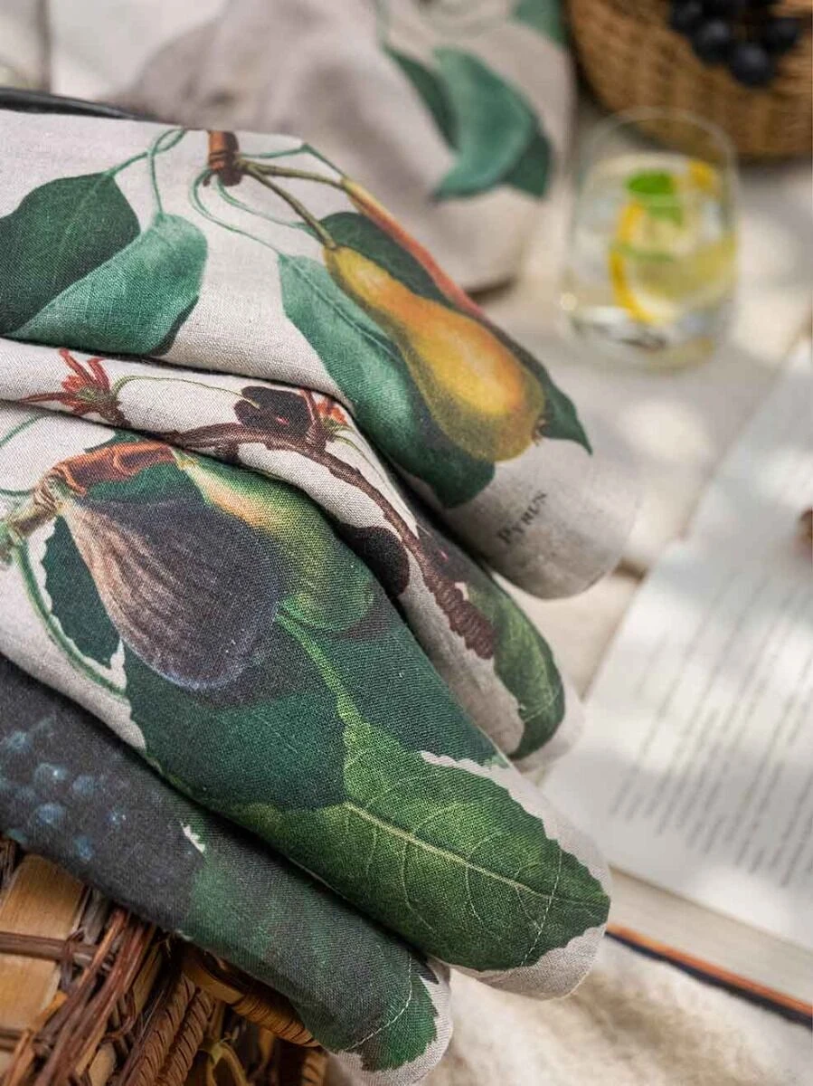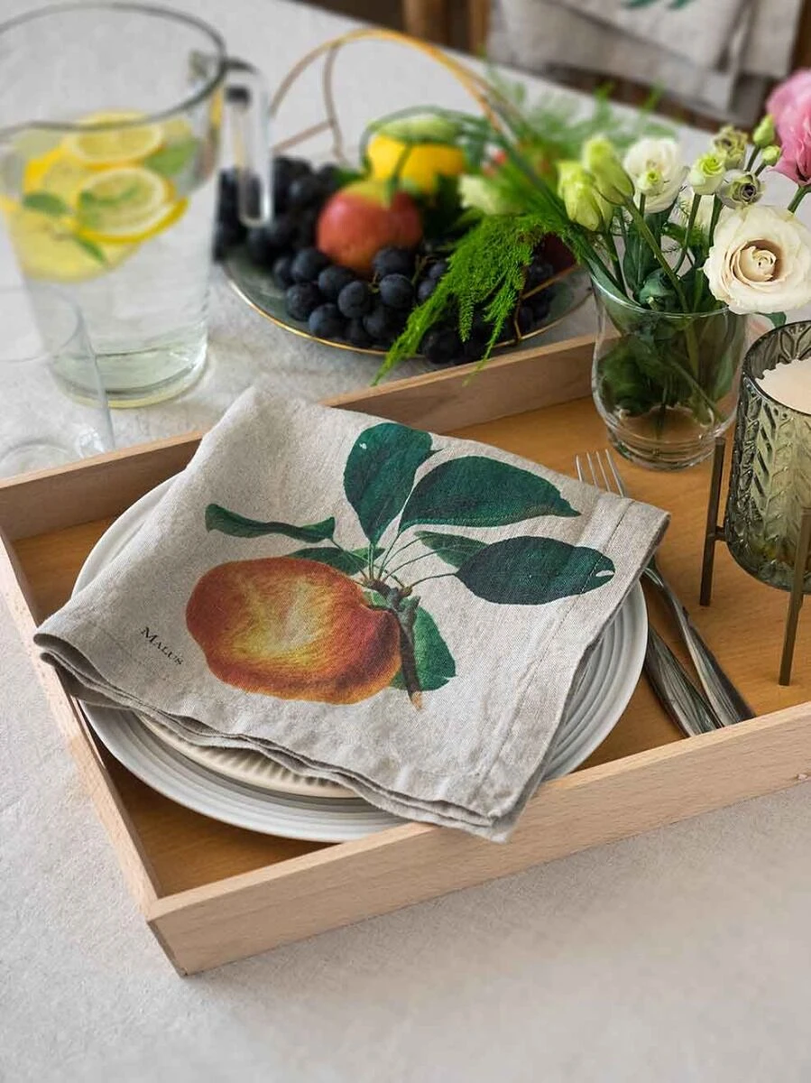 Het Oldenhof Fruits servet is gemaakt van eco-vriendelijk linnen en is uitgevoerd in de kleur beige met een opdruk van diverse fruitsoorten. Het servet heeft een lengte van 45 cm en is 45 cm breed. De set bestaat uit zes stuks met elk een andere opdruk.
