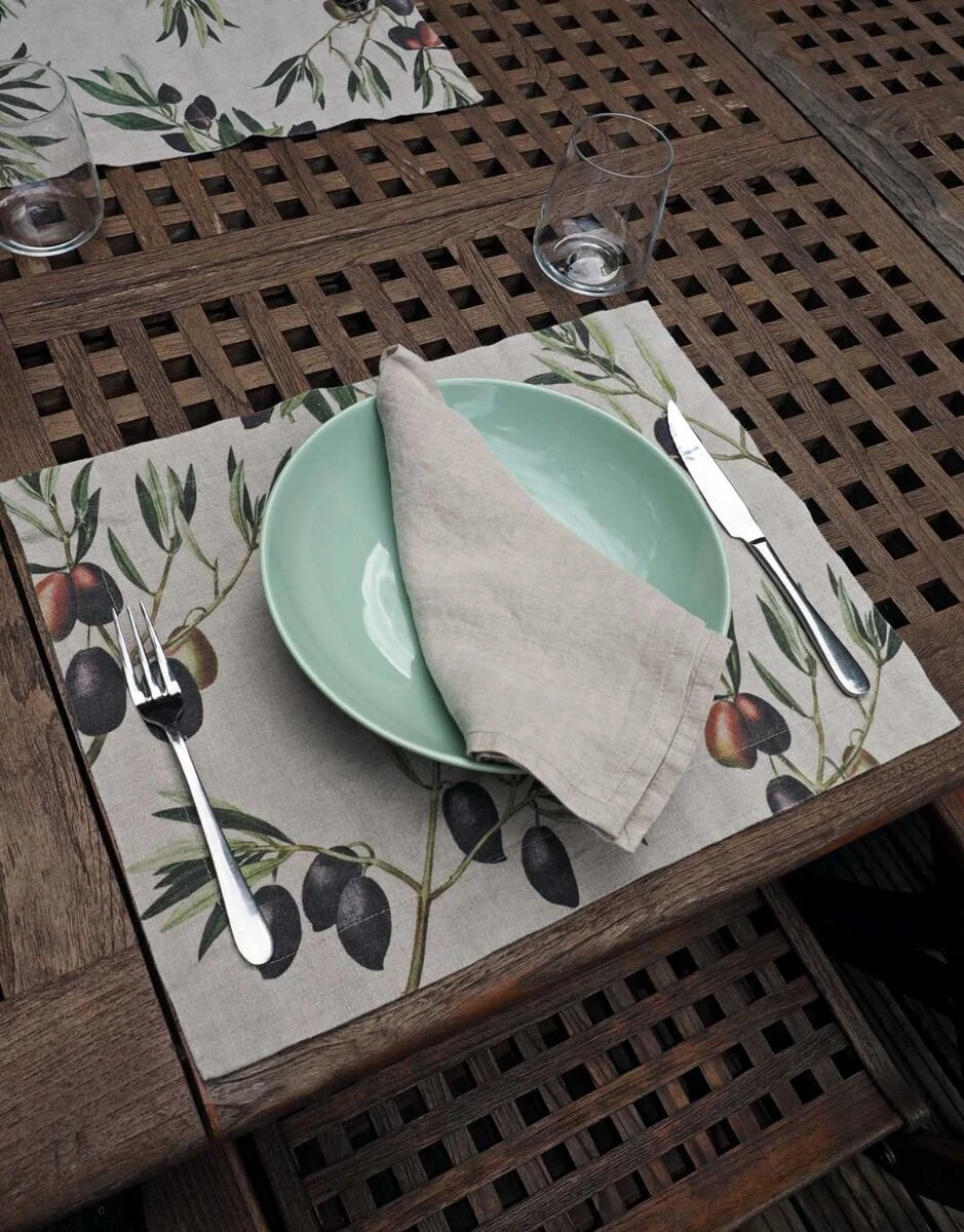 De Oldenhof Olives placemat is gemaakt van eco-vriendelijk linnen en is uitgevoerd in de kleur beige met zwarte olijven. De placemat heeft een lengte van 35 cm en is 48 cm breed. Gebruik de placemat op uw tafel onder uw bord ter bescherming van uw tafel. De set bestaat uit twee stuks.