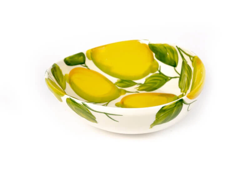 De organische Oldenhof schaal is gemaakt van wit aardewerk en is gedecoreerd met citroenen en bladeren. De diameter van de schaal is 20 cm en de hoogte is 10 cm. Gebruik de presenteerschaal voor salades of andere zomerse gerechten.