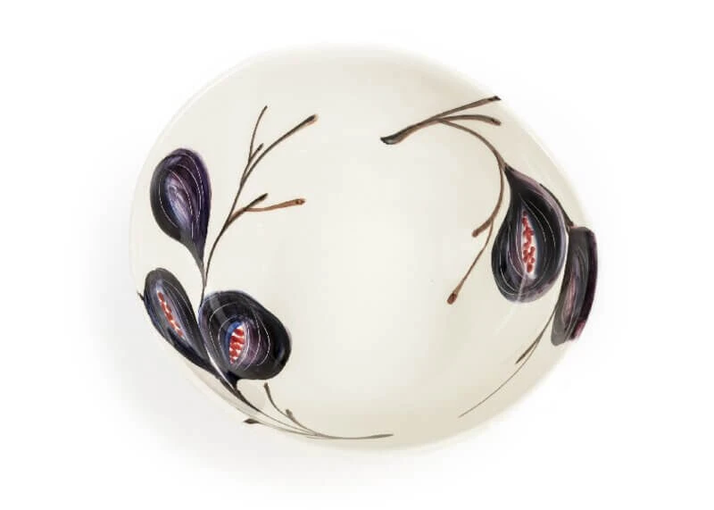 De Oldenhof-schaal heeft een organische vorm met groot vijgenmotief. De schaal is gemaakt van keramiek en heeft een diameter van 25 cm. Het design is 10 cm hoog en te gebruiken voor het presenteren van fruit, (stok)brood of pasta.