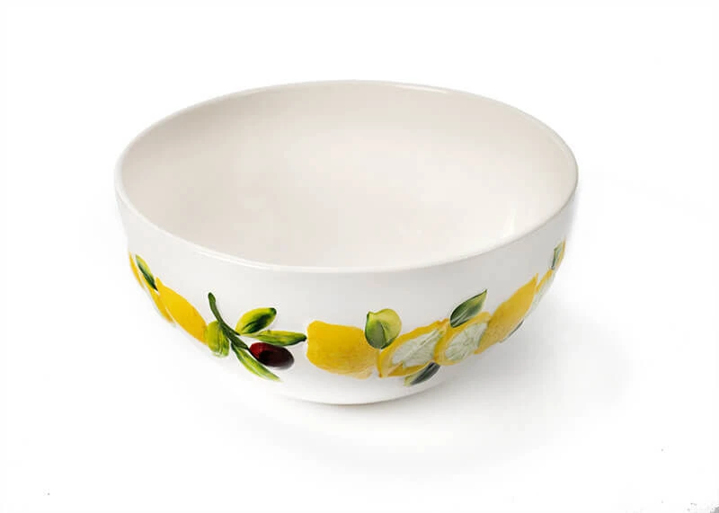De ronde diepe Oldenhof schaal is gemaakt van wit aardewerk en is gedecoreerd met citroenen en olijven. De diameter van de schaal is 21 cm en de hoogte is 10 cm. Gebruik de presenteerschaal voor salades of andere zomerse gerechten.