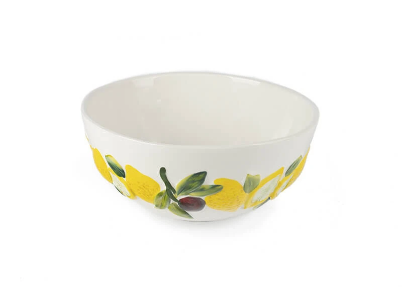 De ronde diepe Oldenhof schaal is gemaakt van wit aardewerk en is gedecoreerd met citroenen en olijven. De diameter van de schaal is 27 cm en de hoogte is 13 cm. Gebruik de presenteerschaal voor salades of andere zomerse gerechten.