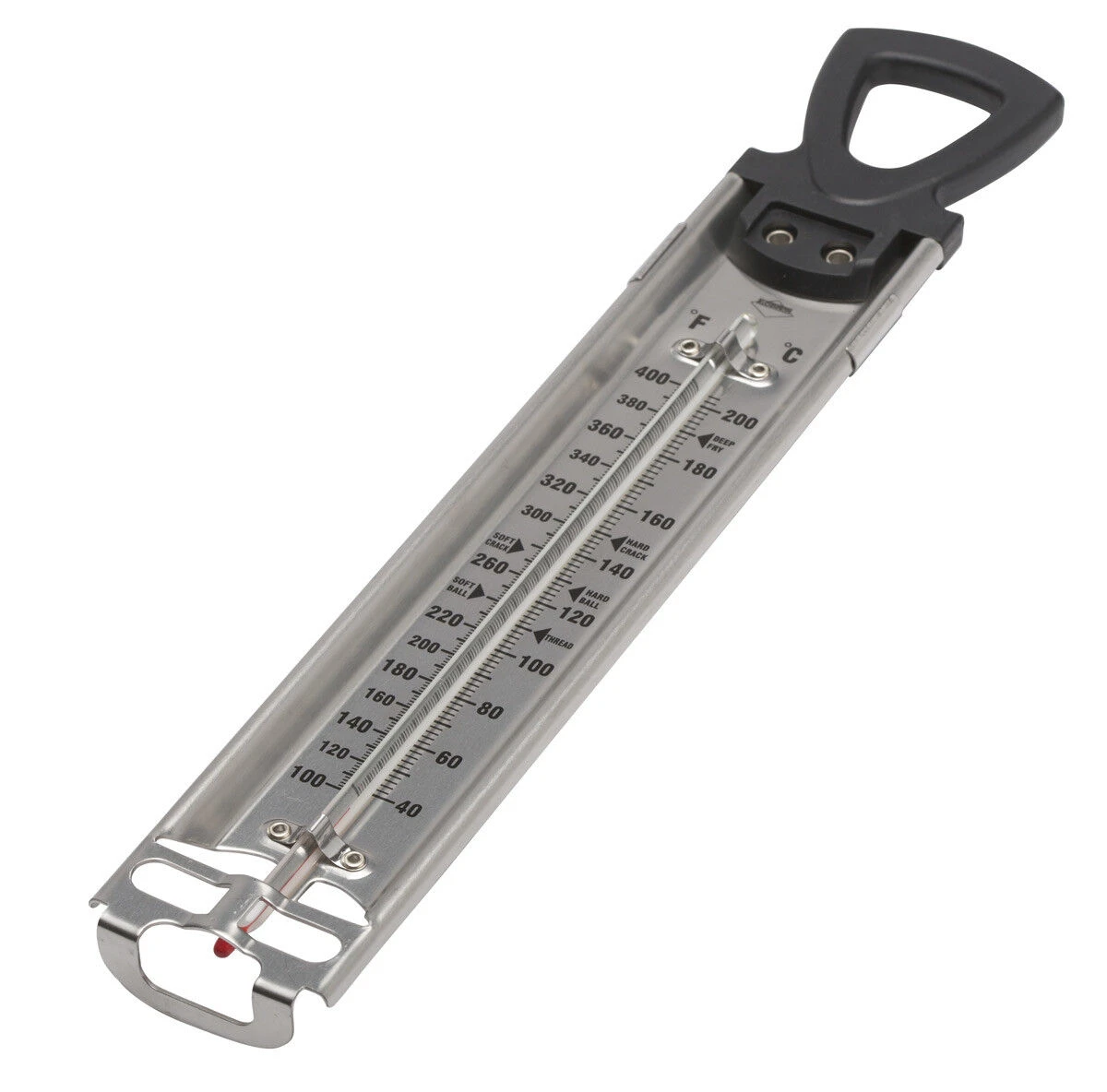 De temperatuurschaal geeft ook de klassieke suikertemperaturen weer, van draad tot harde kraak, zodat u ook oude recepten kunt gebruiken. Met de klem kunt u de thermometer aan de rand van de pan vastklemmen zodat uw handen vrij zijn. De thermometer heeft een temperatuurschaal in Celsius en Fahrenheit.