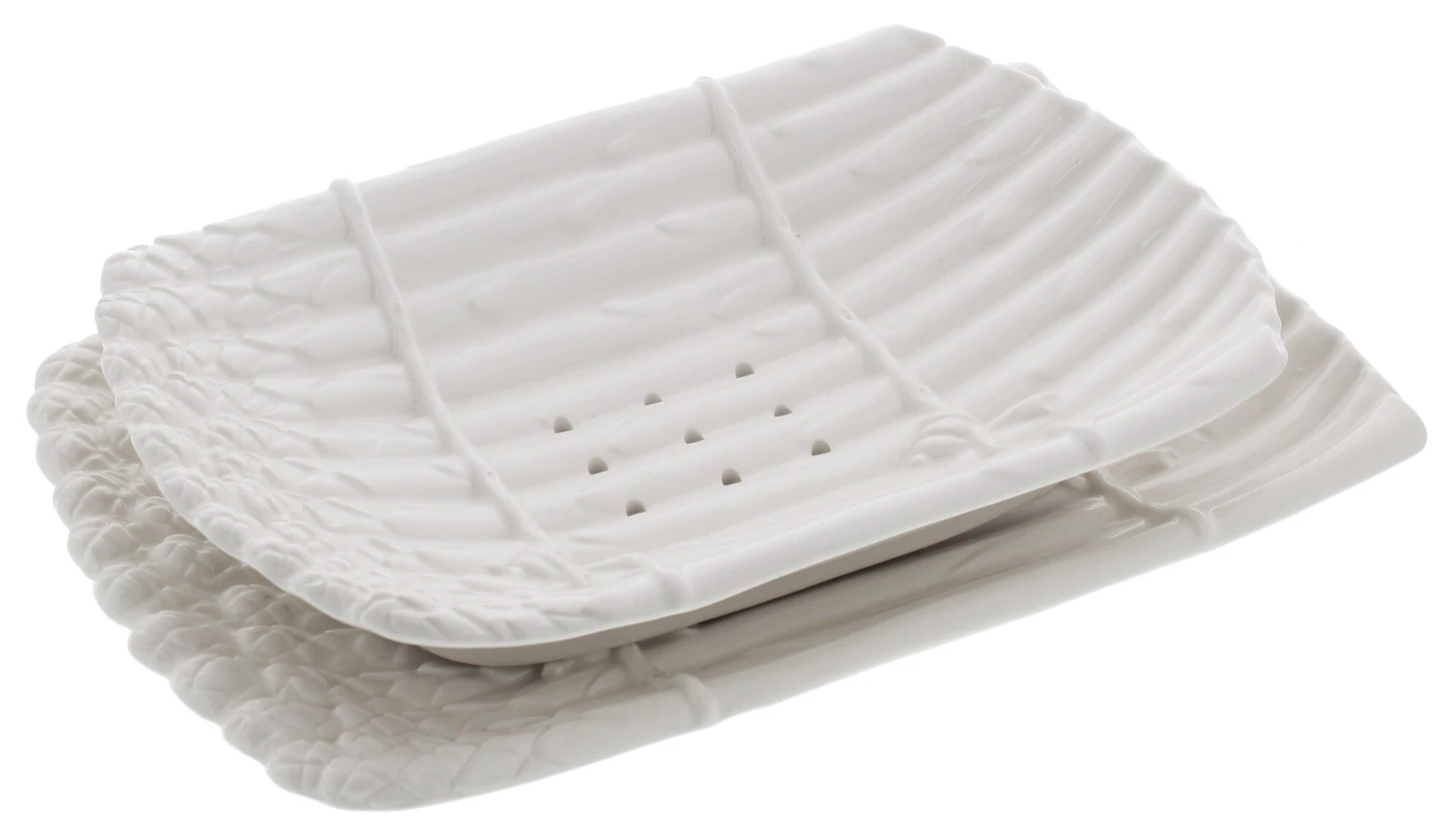 De Oldenhof uitlekschaal met onderbord zijn gemaakt van aardewerk en gebruikt u voor het laten uitlekken en serveren van asperges. Het onderbord heeft een lengte van 34 cm en een breedte van 21,5 cm. De uitlekschaal is 30 cm lang en 20 cm breed.