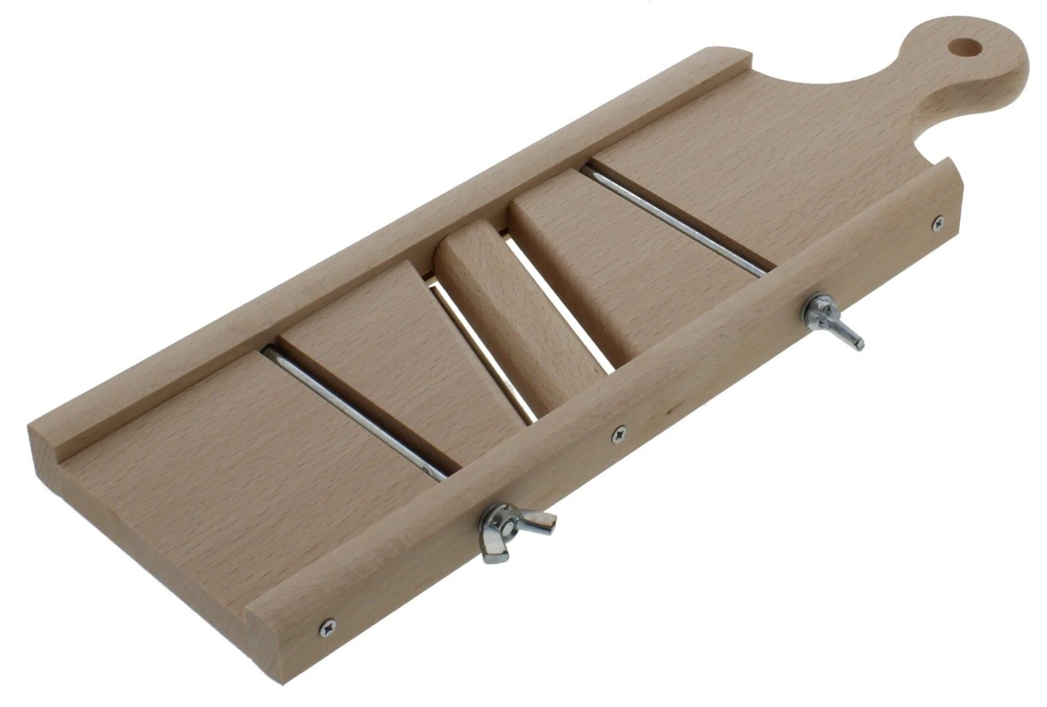 De verstelbare groenteschaaf van Oldenhof is gemaakt van beukenhout. Voorzien van twee roestvrijstalen messen. De beide messen zijn in te stellen qua snijdikte en zijn achter elkaar gemonteerd, iets onder een hoek voor optimaal snijgemak.